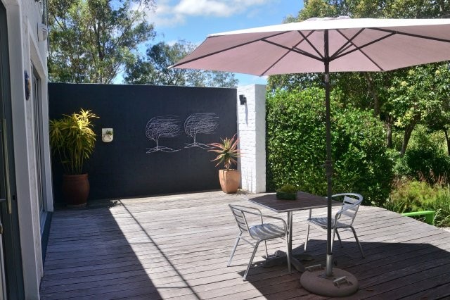 A huge, modern kitchen features a sheltered sunny patio for outdoor dining,